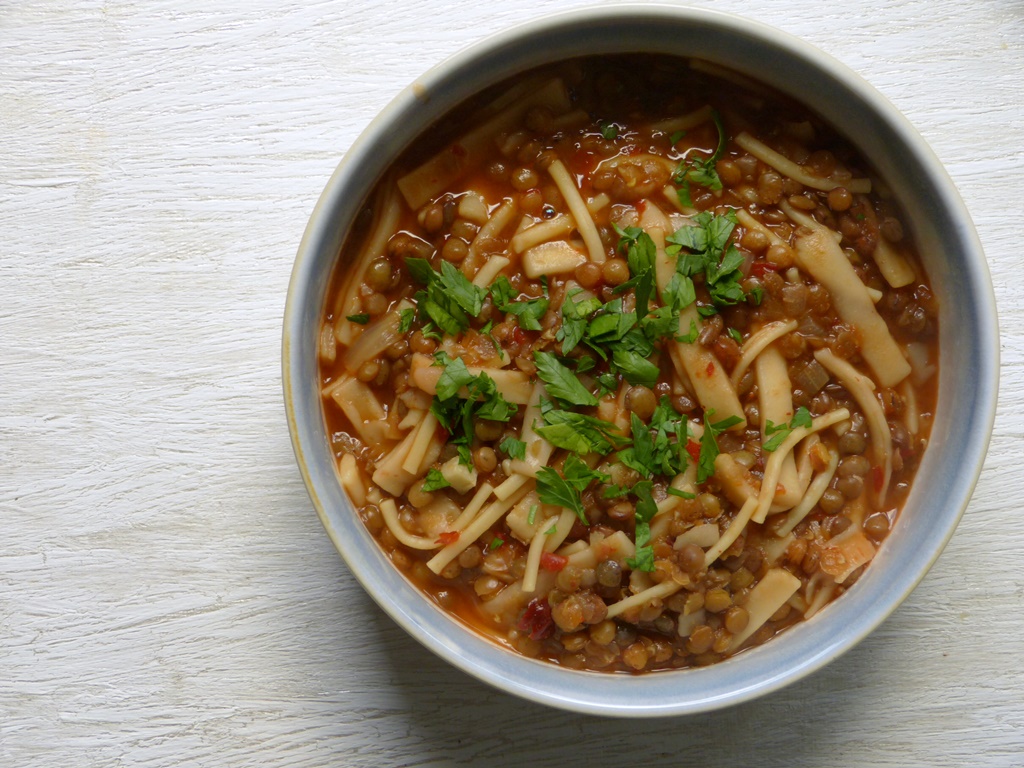Es ist immer wieder faszinierend, wie vielseitig die Kombination Linsen/Nudeln doch ist. Hier ist es eine mit Paprikamark aromatisierte Linsensuppe, die mit Erişte serviert wird. Die Nudeln bestehen aus einem klassischen Nudelteig, werden aber recht kurz geschnitten.