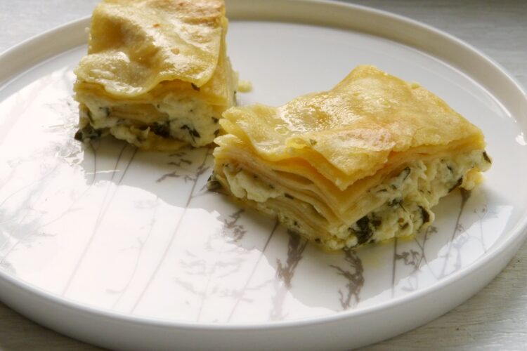 Das ist etwas aufwändigeres Börek, für das einzelne Nudelteigplatten zuerst blanchiert, dann in eine Form geschichtet, mit Butter bepinselt und gefüllt werden. Aufgrund des Blanchiervorganges nennt man dieses Börek auch Wasserbörek. Durch die Herstellungsmethode ist das Börek innen saftig und außen wunderbar knusprig. Dieses Börek kann man mit verschiedenen Füllungen machen – Hackfleisch mit Pinienkernen ist beliebt, Käse mit Spinat, oder, wie hier, Käse mit Petersilie.