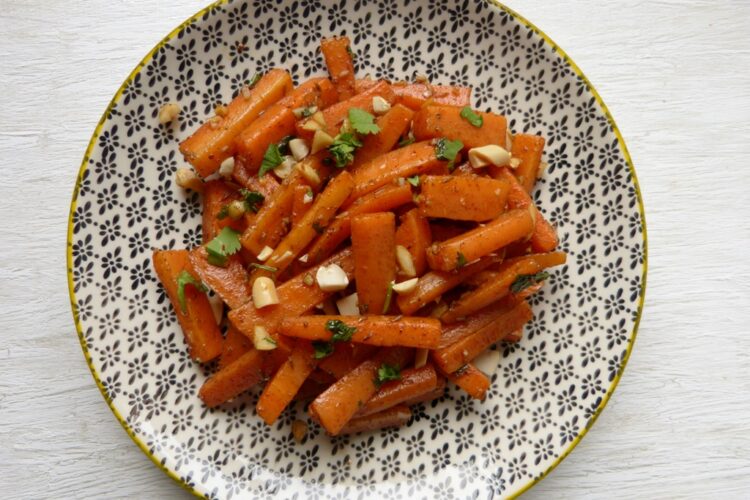 Koriander zupfen und hacken. Die Karotten in eine Schüssel geben, mit Koriandergrün und gehackten Erdnüssen bestreuen und servieren.