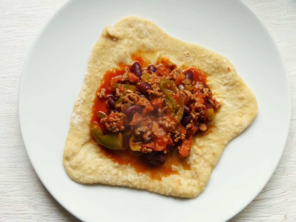 Das Cowboy-Ragout besteht aus Rinderhack, gegarten Bohnen, grünen Paprika, Tomaten, Bier und Chipotles in Adobo. Original wird es in Hotdog-Brötchen serviert; uns waren Tortillas lieber.