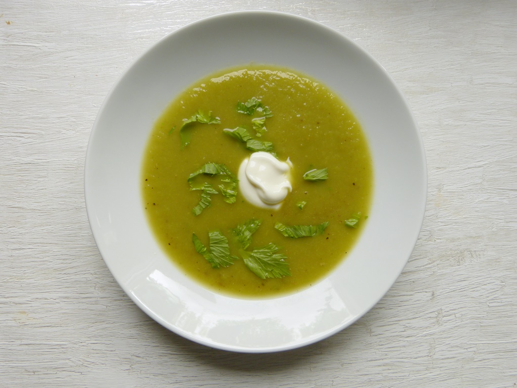 Selleriesuppe – Zutaten: Stangensellerie, Zwiebel, Olivenöl, Gemüsebrühe. Und eine willkommene Idee für den Stangensellerie, der im Gemüsefach langsam aber sicher an Elan verlor.