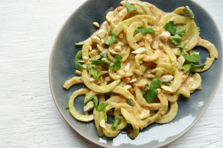 Das Rezept ist wieder wie im Original ohne Mengenangaben – Basis ist die Erdnussbutter, und vieviel Ihr davon nehmt entscheidet – zusammen mit Eurem Geschmack – über die Mengen der anderen Zutaten. Ein Hinweis aber: man braucht recht viel Wasser, um die Erdnussbutter so flüssig zu bekommen, dass sie sich als Dressing eignet. Und: die Gurkenstreifen sind nett, aber der Salat schmeckt bestimmt auch mit in Scheiben geschnittenen Gurken.