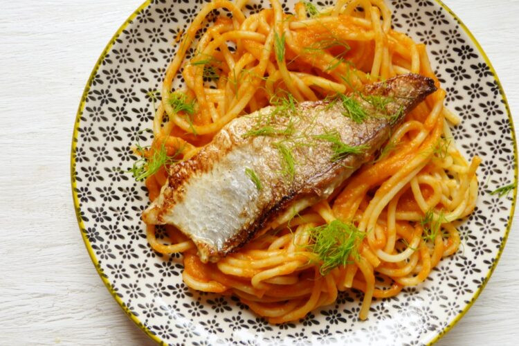 Zum Servieren die Pasta mit der Sauce auf Teller verteilen und mit den gebratenen Fischfilets servieren.