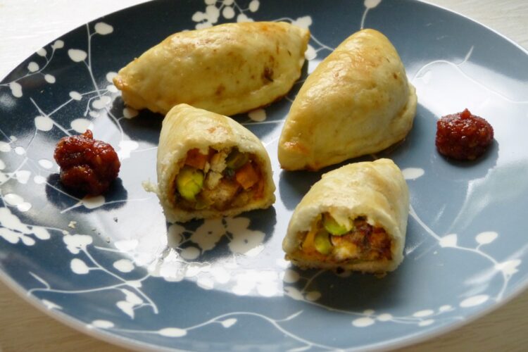 Die ganz klassische Füllung besteht aus pikant gewürztem Hackfleisch; ich stelle euch heute eine vegetarische Variante vor, die ich bei BBC Good Food gefunden habe. Die Füllung ist mit Chilisauce und Currypulver würzig abgeschmeckt und bei der Wahl der Gemüsesorten ist man frei; das ist also ein gutes Rezept, um das Gemüsefach von Resten zu befreien.