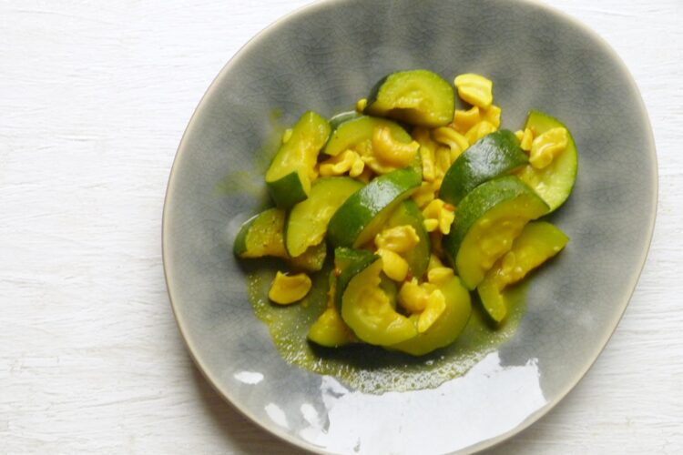 Das Gericht steht in 30 Minuten auf dem Tisch und ist vegan – aber einen gut gefüllten Gewürzschrank braucht man: es wird außer mit Kurkuma mit Asafötida und Bockshornklee gewürzt. Asafötida sorgt für eine Knoblauchnote, Bockshornklee für ein wenig bitteren Geschmack; insgesamt ist das schön ausgewogen. Und die Cashews bringen sorgen für Biss und machen satt. Also los, so lange es noch Zucchini gibt.