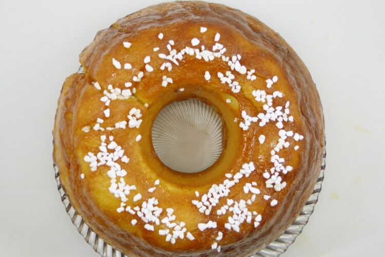 Das ist einfacher Hefekuchen, der aber durch eine lange Gare ein schönes Aroma bekommt. Im Rezept wird er in einer Gugelhupfform gebacken, ich habe aber auch Bilder gesehen, in denen der Kuchen wie ein Panettone aussieht. Der Clou ist der Zuckersirup, mit dem der fertige Kuchen glasiert wird und der Hagelzucker, der für Crunch sorgt. Den Kuchen kann man einfach so essen, aber auch zum Frühstück mit etwas Butter und / oder Marmelade – oder man tunkt ihn einfach in den Kaffee, das ist meine Lieblingsvariante.