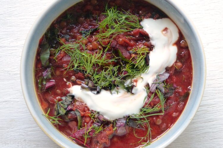 Vom Rote-Bete-Grün die Stiele entfernen und die Blätter in Streifen schneiden. Dill zupfen und grob hacken. Einen Großteil von Beteblättern und Dill zur Suppe geben und alles noch etwas köcheln lassen; die Linsen sollen gar sein, aber nicht matschig.