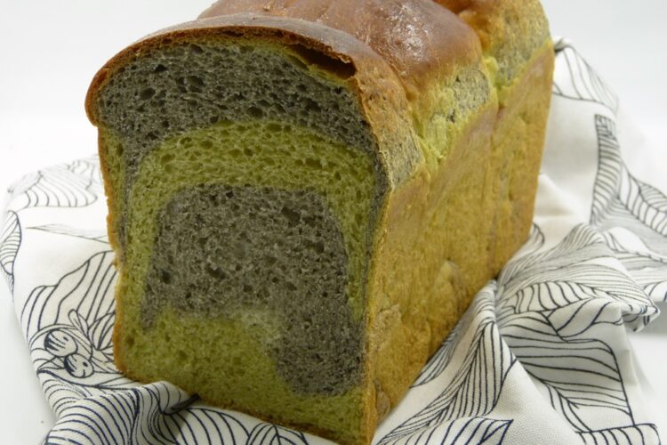 Heute habe ich das ganze mal in Brotform gebracht. Der Teig wird in 2 Teile geteilt und marmoriert. Das sieht hübsch aus – und wirkt sich auch geschmacklich aus. Der grüne Teil schmeckt ganz leicht grasig und bitter und der dunkle etwas nussig. Das Brot ist nicht besonders süß; ich finde, es schmeckt besonders gut mit gesalzener Butter. Kristina Cho empfiehlt außerdem die Kombination Erdnussbutter-Honig.