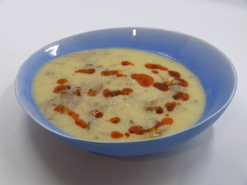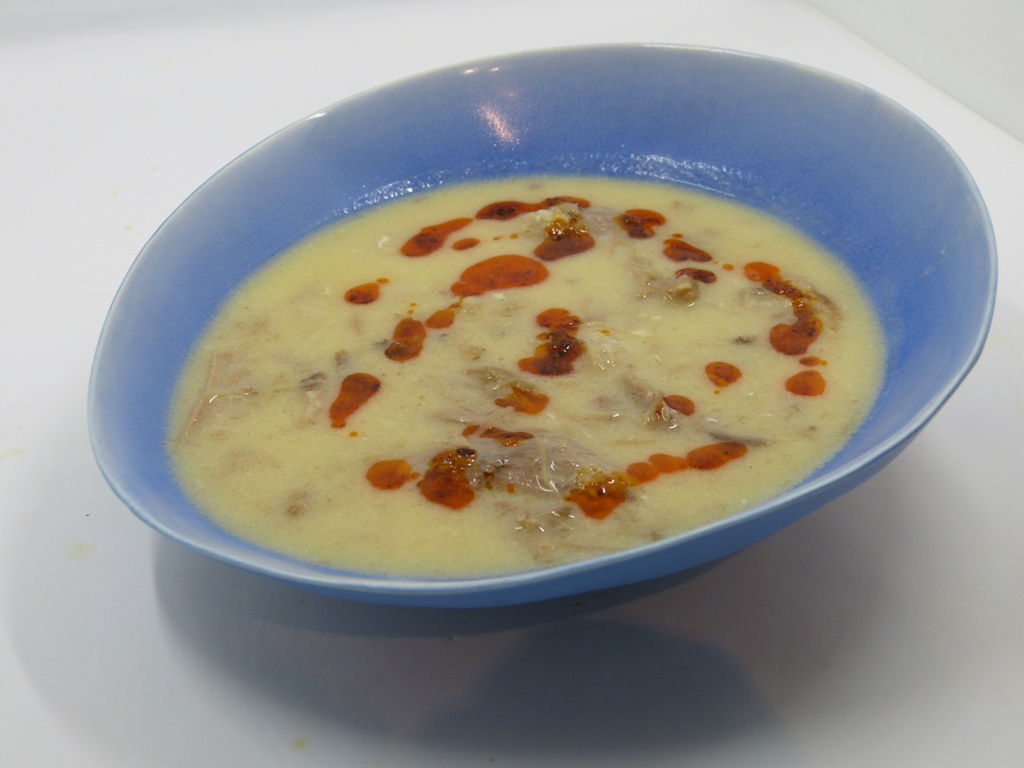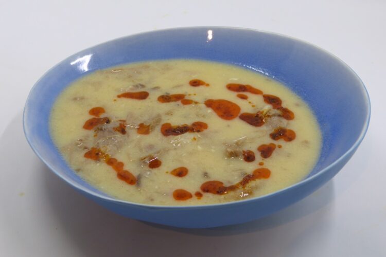 Für die Suppe wird zunächst eine Brühe gekocht; die Brühe wird mit einer Mehlschwitze gebunden und dann noch mit Joghurt und Ei. Sie ist dadurch schön samig und sättigend und die Säure des Joghurts tut ihr auch gut. Serviert wird sie mit etwas Chilibutter. Das Rezept von Orkide und Orhan Tançgil* verwendet als Basis für die Brühe Lammhals – zur Not kann man sie auch mit Rindfleisch kochen, aber Lammhals macht die Suppe üppiger und schmeckt auch ganz anders. Lammhals gibt es im türkischen Lebensmittelladen.