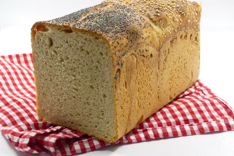 Brot aus der Form stürzen, mit Wasser besprühen und auf einem Kuchengitter abkühlen lassen.