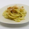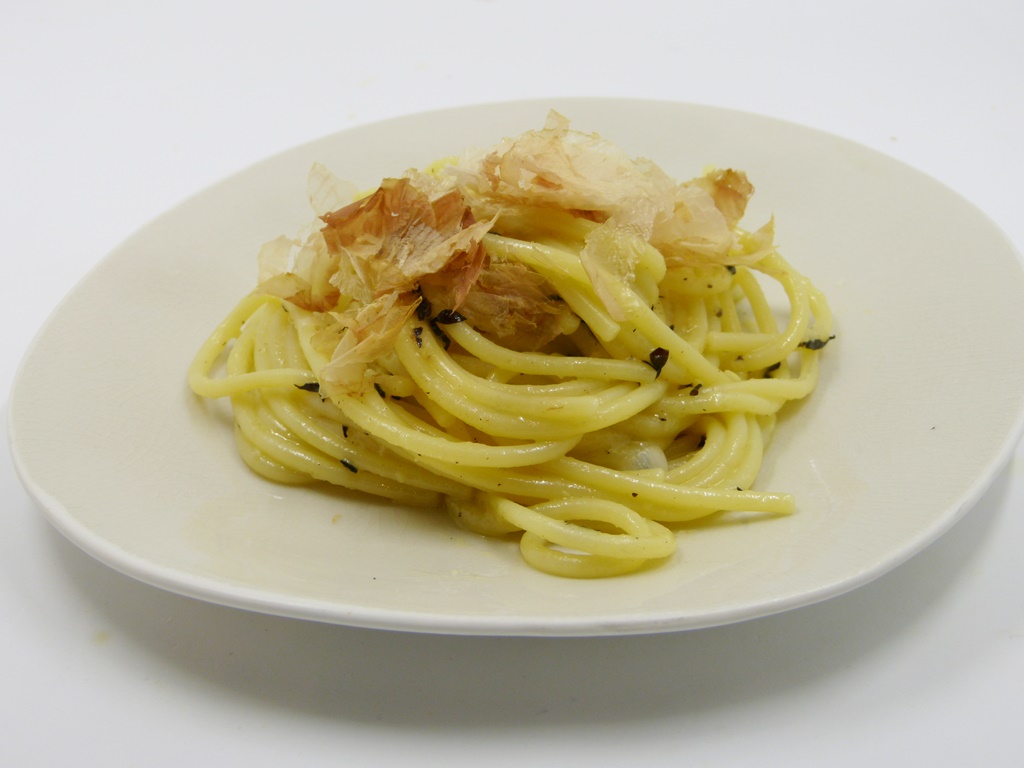 Japanische Carbonara – Eier sind dran und Parmesan, aber auch Seetang und Katsuoboshi, also getrockneter, in feine Flocken gehobelter Thunfisch – wir fanden das genial, sogar der Seetangskeptiker in der Familie.