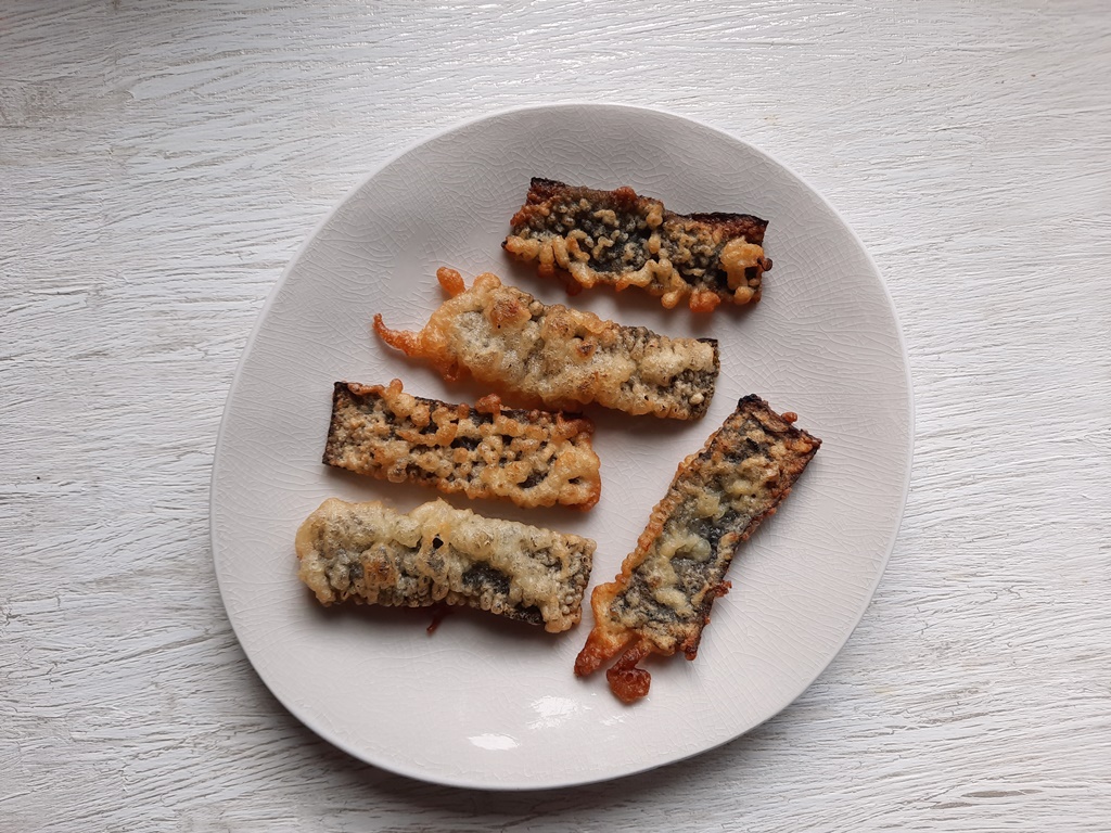 Nori-Tempura – einfach und gut. Noriplatten, wie sie sonst für Sushi verwendet werden, werden in Streifen geschnitten, durch Tempurateig gezogen und frittiert. Ein schöner Snack.