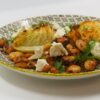 Eine Pfanne sehr stark erhitzen. Den Knoblauch schälen und in der heißen Pfanne ca. 3 min rösten, er soll sehr dunkel sein. Beiseite stellen.