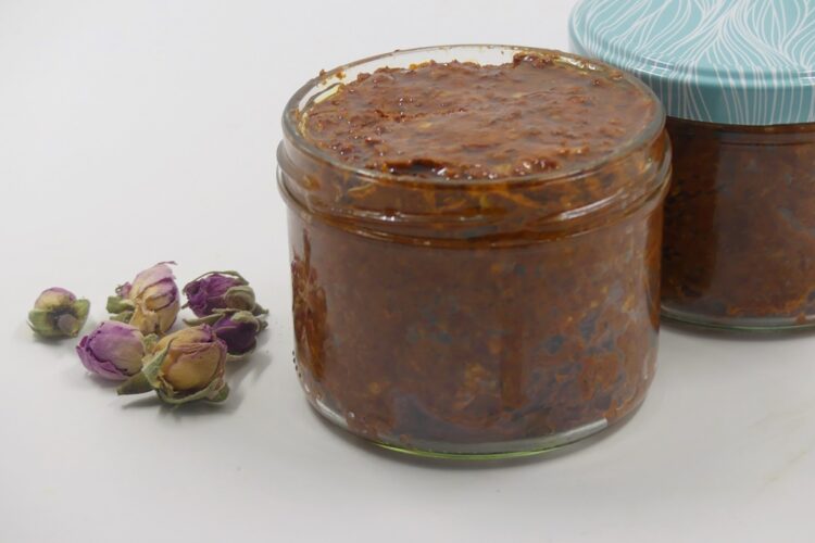Klassische Harissa besteht aus Chilis, Knoblauch, Kreuzkümmel, Koriander, Olivenöl, Salz und etwas Essig. Bei der Rosenharissa kommen noch Rosenblütenblätter und etwas Rosenwasser dazu – die Paste ist immer noch scharf, aber doch etwas milder und hat eine leicht blumige Note.