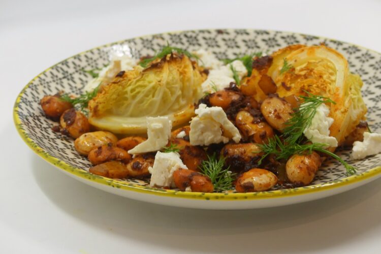 Zum Servieren den Kohl mit den Bohnen auf Teller verteilen, etwas Feta darüber geben und Dill darüber zupfen.
