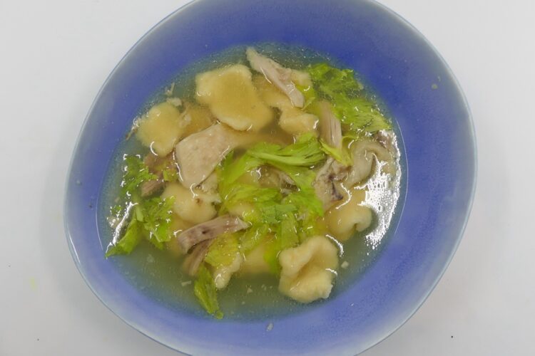 Dieses Rezept hier kommt von Eric Kim*, und es ist eine Mischung aus einer klassischen Hühnersuppe und den koreanischen Nudeln. Die Suppe ist ordentlich mit Lorbeer und Knoblauch gewürzt. Am Nudelteig ist etwas Kartoffelstärke – sie werden so besonders bissfest. Die Nudeln werden in der fertigen Suppe gegart, das dickt diese etwas an.