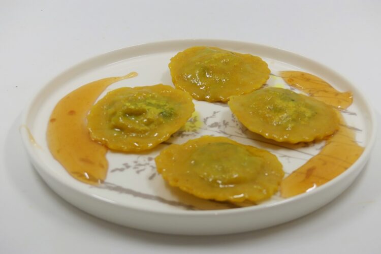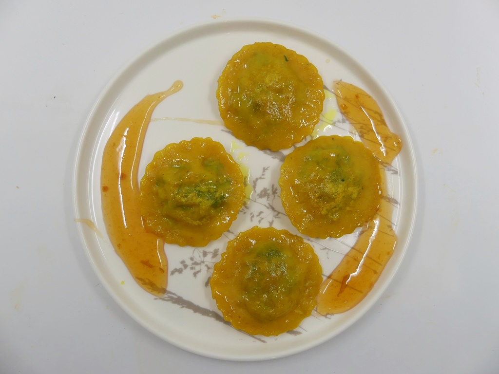 Den Teig auf der leicht bemehlten Arbeitsfläche ca. 1 mm dünn ausrollen und mit einem Ausstecher mit gewelltem Rand Kreise von 6 cm Durchmesser ausstechen. Auf die Mitte jedes Kreises etwas Füllung geben, eine zweite Teigscheibe darauf legen und die Ränder gut festdrücken. So weitermachen, bis Teig und Füllung aufgebraucht sind.