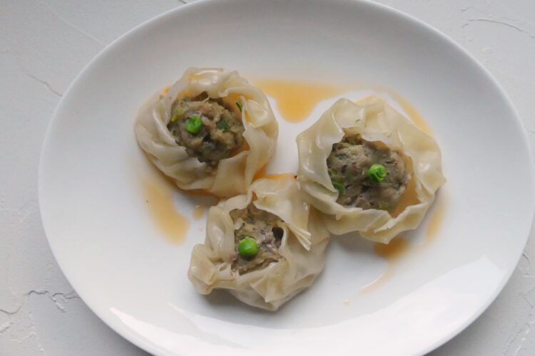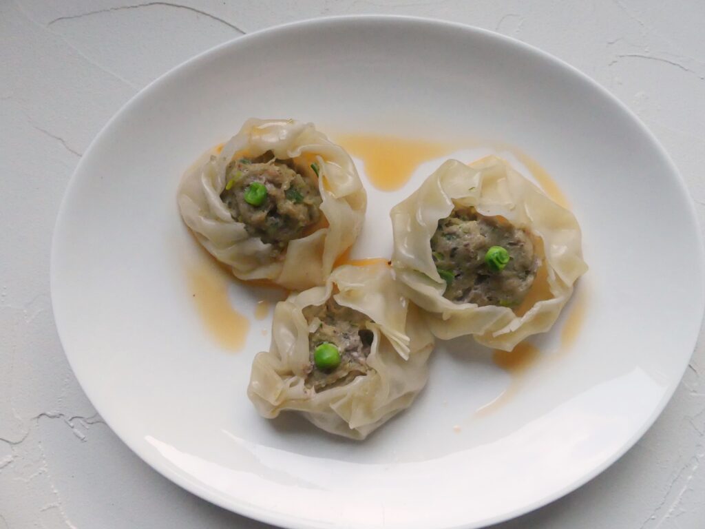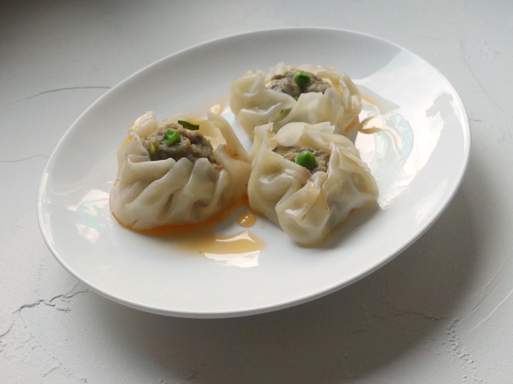 Heute machen wir teigtaschentechnisch einen Ausflug in die klassische kantonesische Dim-Sum-Küche. Die kleinen Körbchen kommen ursprünglich aus Nordchina, haben sich aber rasch verbreitet und im Süden hat man sie an den eigenen Geschmack angepasst. Im Norden werden die Körbchen gerne mit Klebreis und Hackfleisch gefüllt und sie haben eine Taille; das hier ist die bekanntere Version aus Guangdong und Hongkong mit einer Füllung aus Schweinefleisch und Garnelen.