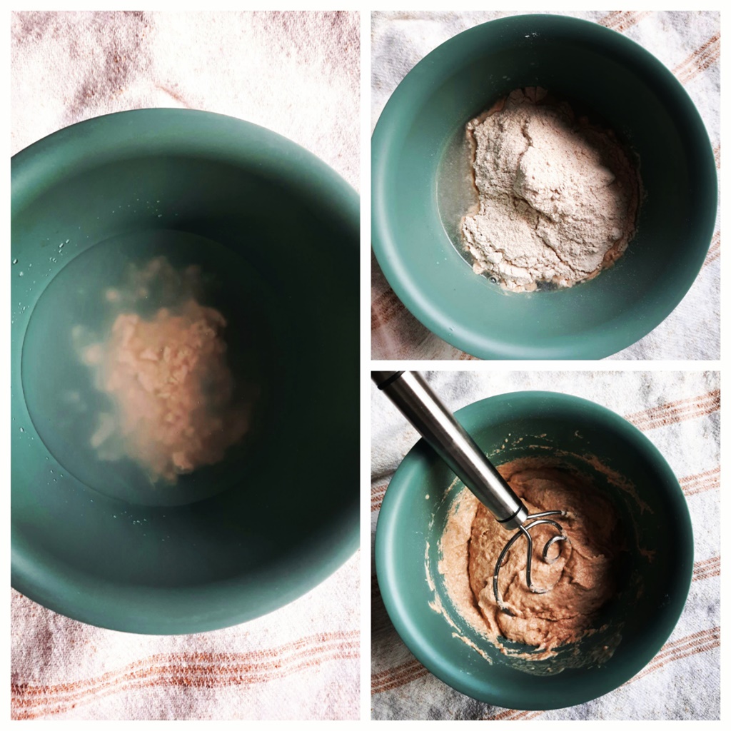 Alles grob zu einem Ball formen und bedeckt zu doppelter Größe aufgehen lassen; bei mir hat das ungefähr eine Stunde gedauert.