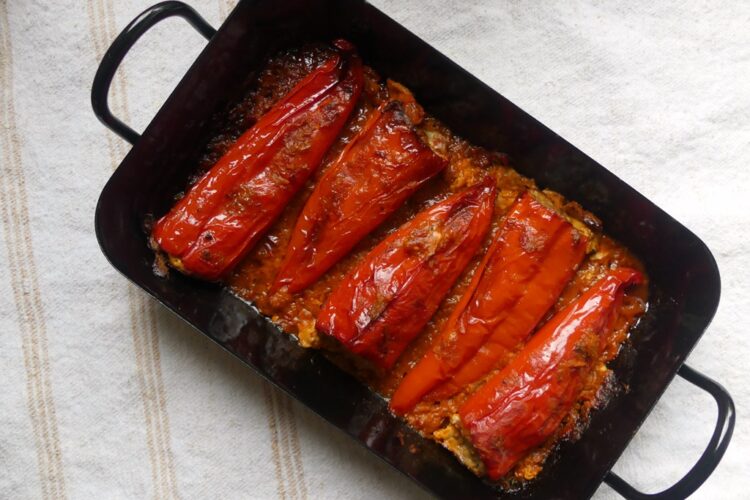 Jetzt gibt es aber erst mal etwas anderes: ich hatte noch Aivar im Kühlschrank, der weg musste, und da kam mir dieses Rezept aus dem schönen Istrien-Kochbuch von Paola Bacchia* sehr entgegen. Die Spitzpaprika werden ganz klassisch mit Hackfleisch und etwas Reis gefüllt, aber die Füllung ist dank Kreuzkümmel und Paprikapulver sehr aromatisch. Der Clou ist aber sie Sauce – die besteht aus Aivar, und dessen Röstaromen machen wirklich Spaß. Allerdings würde ich beim nächsten Mal ganz entspannt die doppelte Menge an Sauce zubereiten.