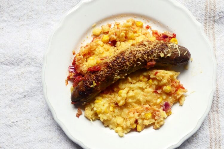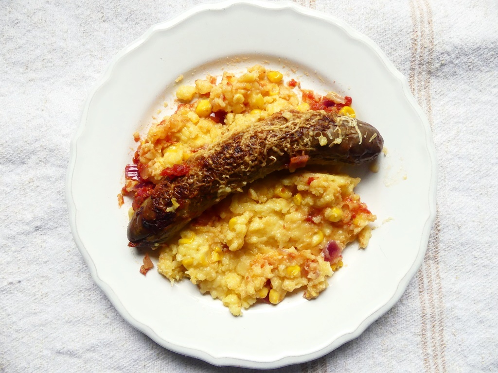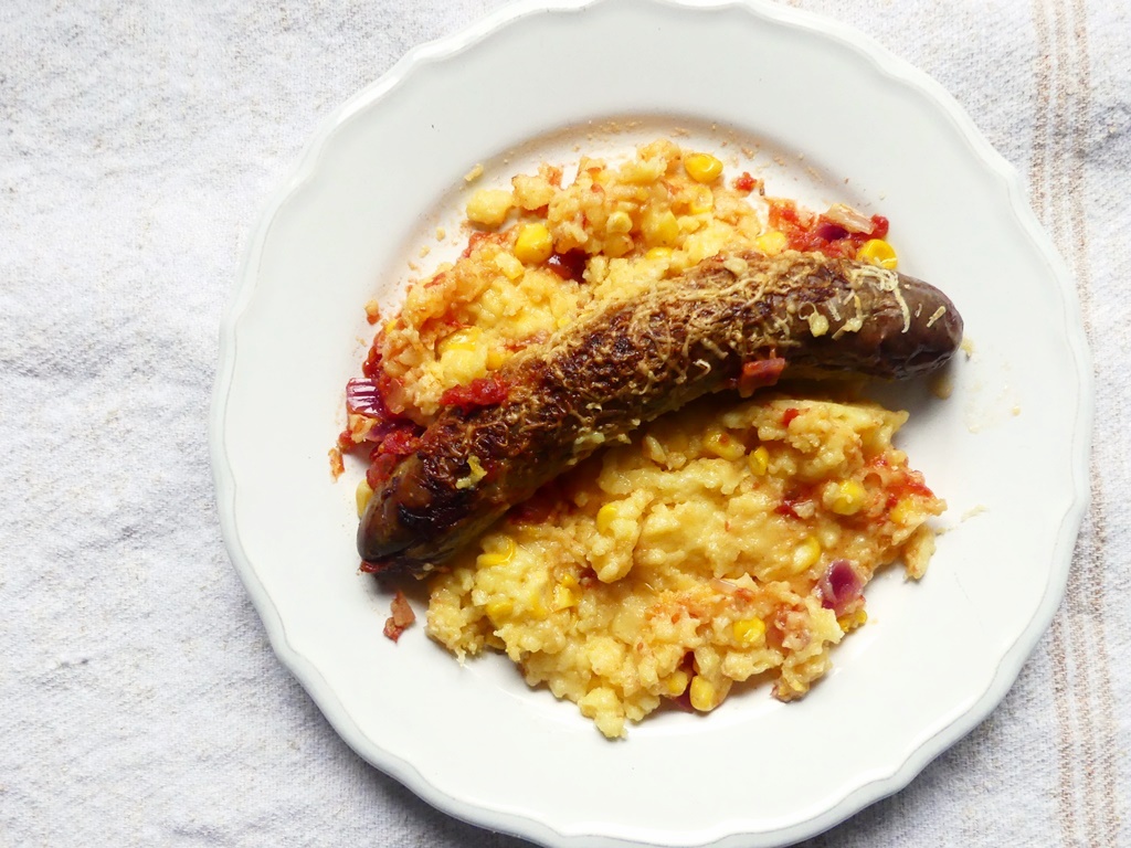 Geworden ist es dann Pap en Wors. Pap ist eine Art sehr festes Porridge aus Maismehl. Serviert wird es mit Käse, einem Tomaten-Zwiebel-Relish und Bratwurst. Eigentlich ist da die südafrikanische boerewors gemeint, das sind große spiralförmige Brawürste, die einen Anteil an Wildfleisch haben; gerne Antilope oder Zebra. Ich habe statt dessen auf Wildbratwürste zurück gegriffen.