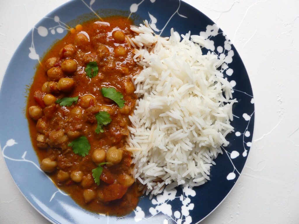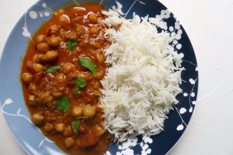 Das ist unser bisheriges Lieblingsgericht aus Hanna Olvenmarks „40-€-Woche„*. Es ist ein einfaches, aber aromatisches Curry mit Garam Masala, Knoblauch, Ingwer und etwas Sambal Oelek. Wenn die Kichererbsen erst mal gekocht sind, steht das Gericht ziemlich fix auf dem Tisch – man braucht ca. 30 Minuten, das geht auch noch nach Feierabend.