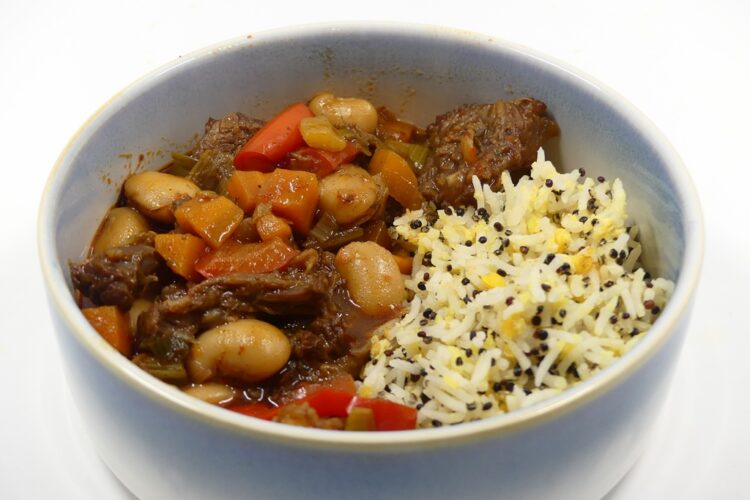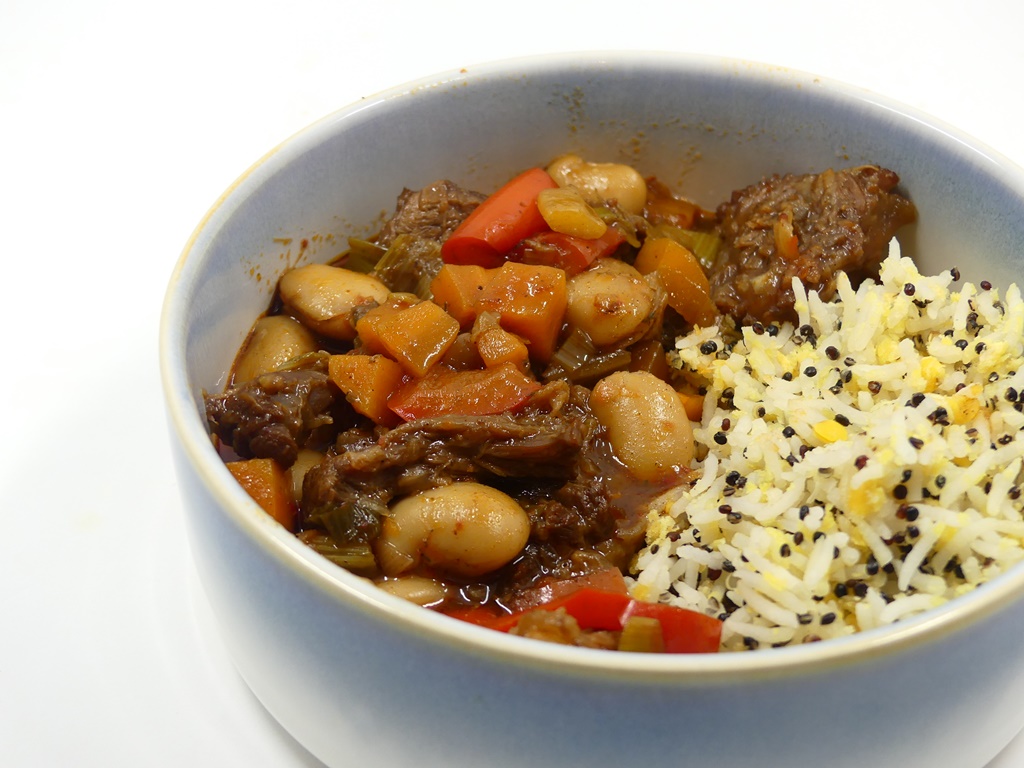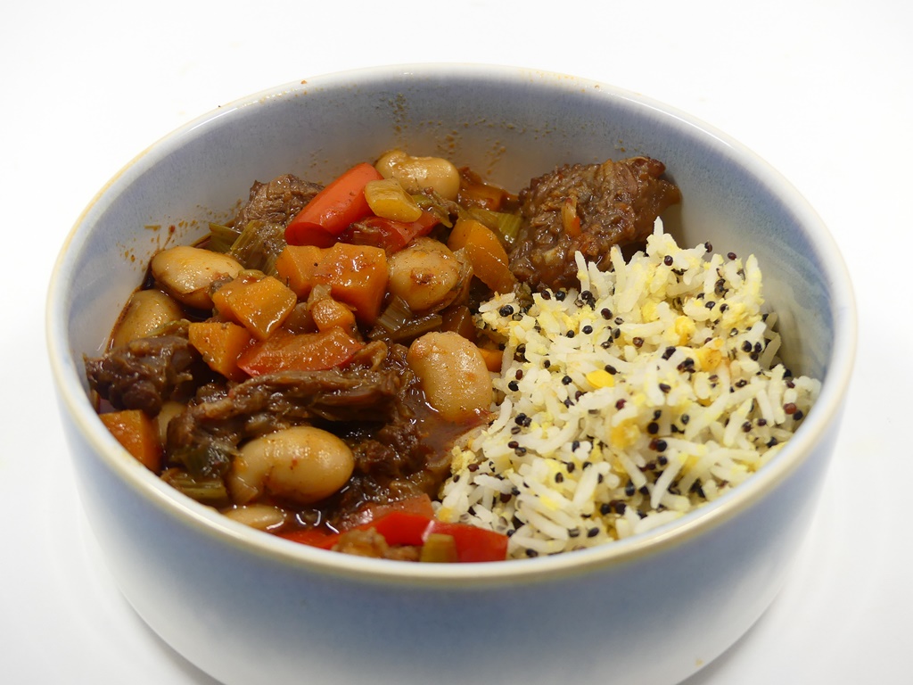 Das Stew kann mit Reis essen oder mit dem Nationalgericht Reis und Bohnen. Ich habe mich für ein Zwischending entschieden und eine Reismischung mit Linsen und Quinoa verwendet. Im Orignalrezept des Sainsbury’s Magazine wird das Fleisch nicht von Knochen gezupft, ich habe das anders gemacht, das ist schöner zu essen.