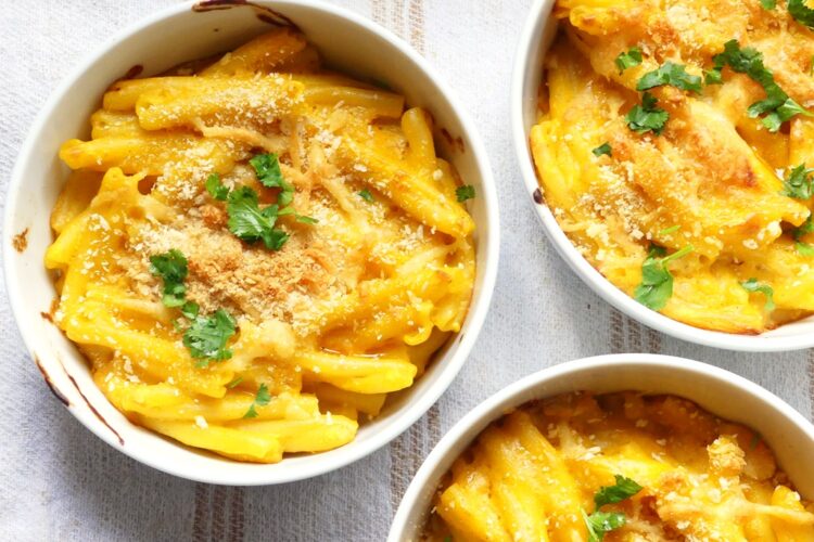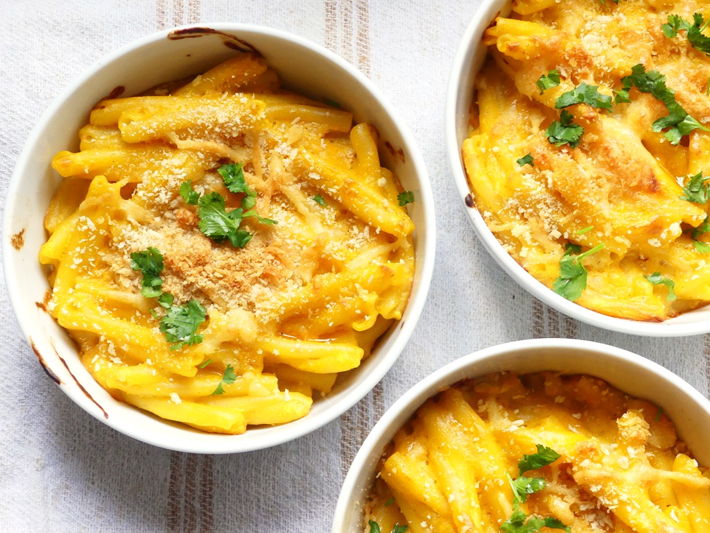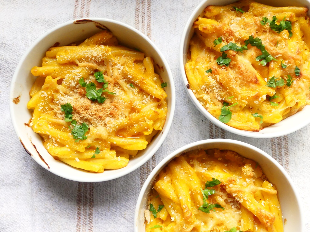 Im Grunde ist das ja eine Abwandlung von Mac ’n‘ Cheese – gegarte Pasta wird mit einer käsehaltigen Bechamelsauce überbacken, und die Sauce wird eben mit gegarten Karotten angereichert. Das Rezept kommt aus einem kleinen steinalten Büchlein, das die vegetarischen Rezepte der Golden-Temple-Restaurants vorstellt (das sind die mit dem Yogi-Tee, zumindest prangt das Logo auf dem Cover). Ich habe das Büchlein bei einer Tee-Lieferung mitbestellt und nutze es gern – erstaunlicherweise ist es noch zu haben*.