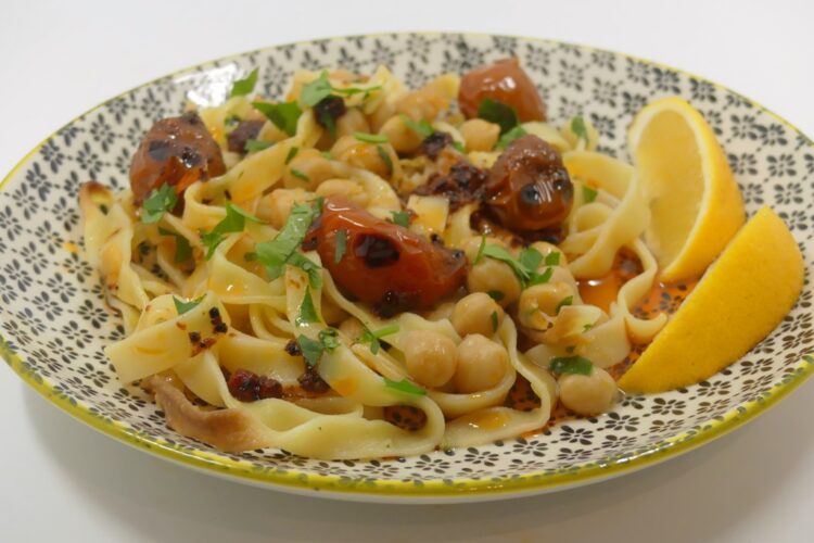One-Pot-Pasta hat in diesem Haushalt nicht den allerbesten Ruf, aber das hier ist eine Variante, die uns gut gefallen hat – was nicht so verwunderlich ist, denn sie kommt von Yotam Ottolenghi. Es ist ein vegetarisches Gericht aus Grundnahrungsmitteln – Pasta und Kichererbsen spielen die Hauptrolle. Die Pasta wird vorneweg geröstet – das gibt auch nach dem Garen noch eine spannende Konsistenz.