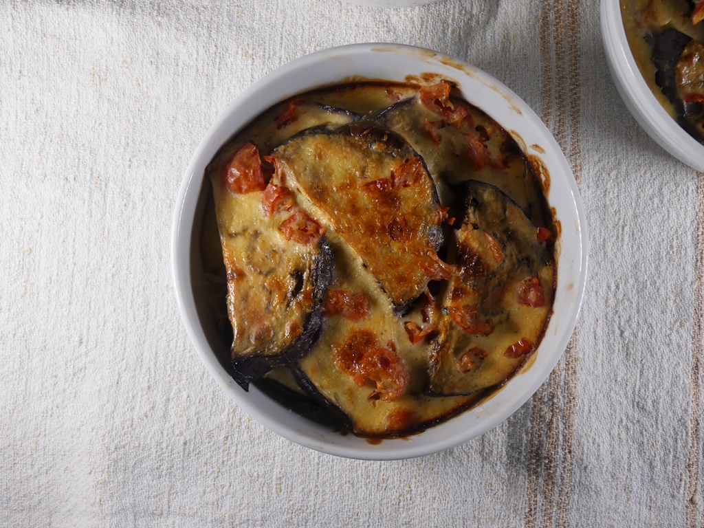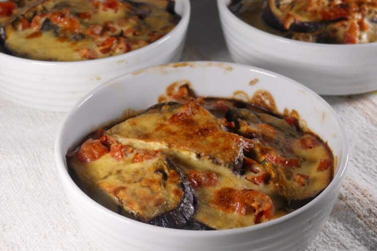 Die Moussaka könnt Ihr in einer größeren Auflaufform backen oder etwas eleganter in kleineren Portionsförmchen. Dazu passt ein grüner Salat.