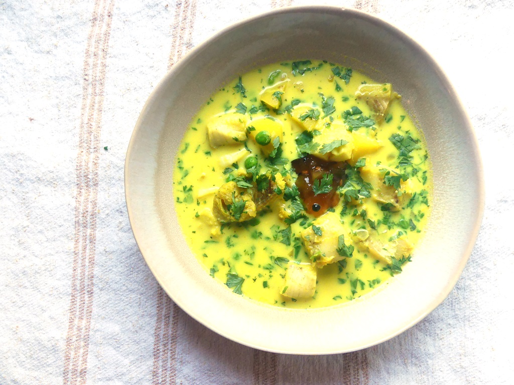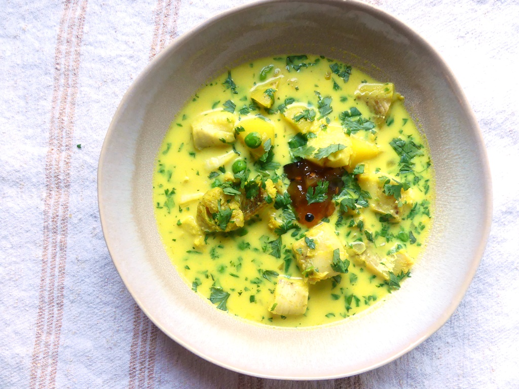 Chowder sind ja eher dickflüssige, cremige Suppen, für mich geht das mit der reichlichen Einlage schon sehr in Richtung Eintopf. Hier besteht die Einlage aus weißfleischigem Fisch – eine Mischung mit Garnelen geht auch – Kartoffel und Erbsen. Und warum Coronation Chowder? Wegen des verwendeten Currypulvers und des Mangochutneys; die Inspiration hierfür kommt von delicious magazine.
