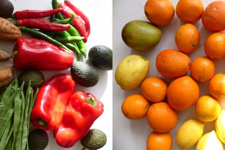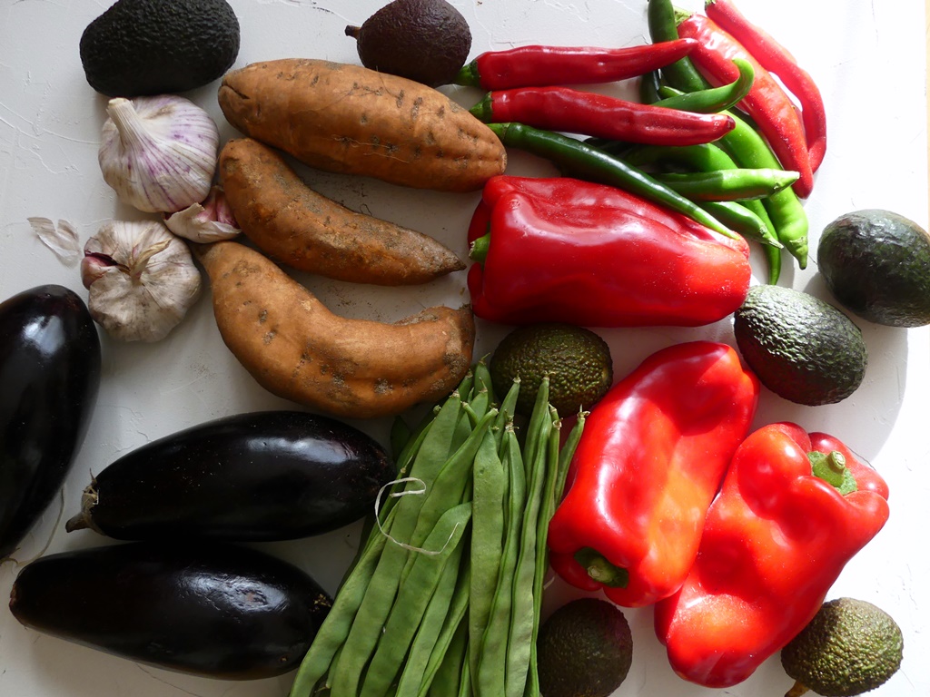 An Gemüse gab es: Stangenbohnen, rote Paprika, Chilis, Auberginen, Süßkartoffeln und Avocado – davon jeweils ein Kilo und je 250 g Knoblauch und Chilis.