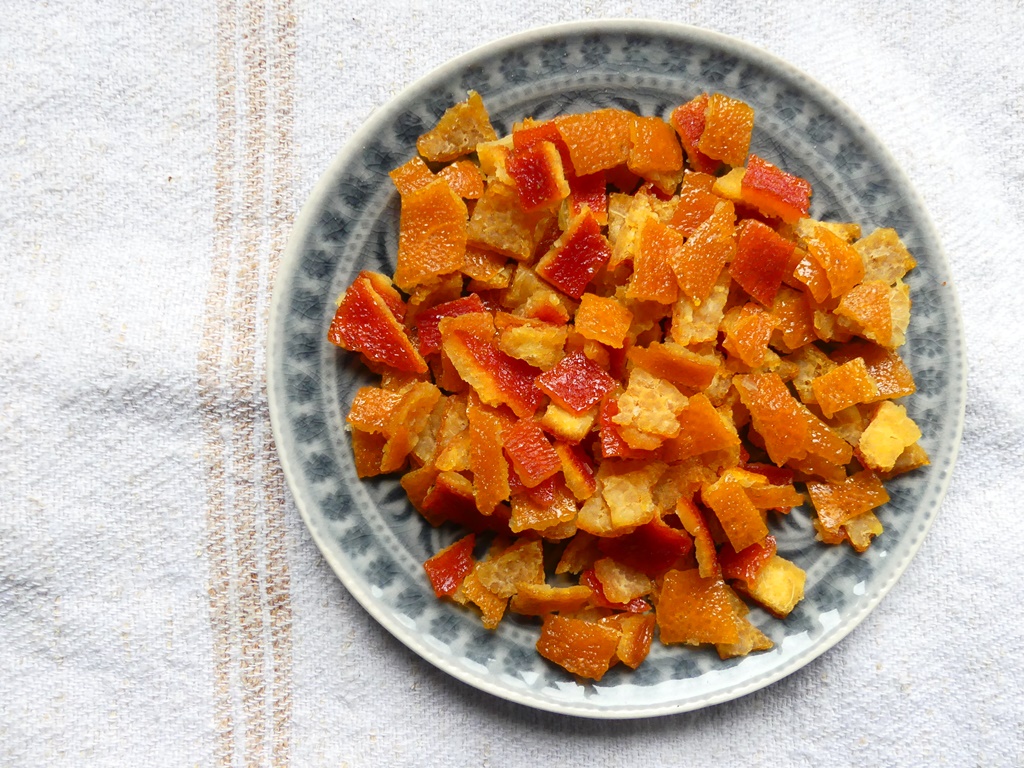Schalen von Clementinen oder Mandarinen hebe ich auch auf. Man kann sie wie oben erklärt abreiben und einfrieren. Mandarinenschale braucht man öfter mal am Stück und getrocknet für chinesische Gerichte – da mache ich nicht viel Aufwand; ich schneide die Schalen etwas klein und lagere sie auf Küchenpapier, bis sie trocken sind. Ich wollte noch kandierte getrocknete Mandarinenschale nach kantonesischer Art machen, ein Snack, den es hier nicht zu kaufen gibt. Das Aroma (süß-salzig, mit leichter Lakritznote) habe ich hingekriegt, die Konsistenz nicht; meine war zu hart, da muss ich nochmal ran.