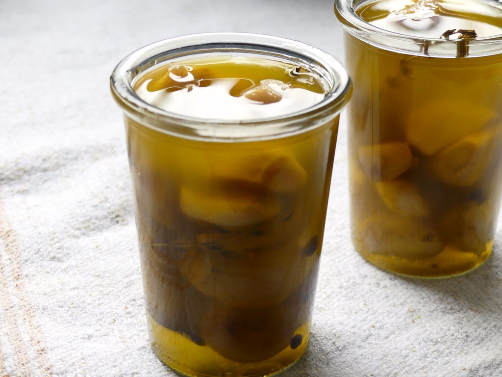 Knoblauch kann man gut lagern – an einem kühlen Ort, nicht im Kühlschrank – und einfach so ans Essen geben. Ich habe ihn diesmal aber konfiert, nach griechischer Art mit Gewürzen. Das schmeckt nicht nur gut, sondern man bekommt zusätzlich auch noch ein gutes Knoblauchöl und holt so das meiste aus dem Knoblauch heraus.