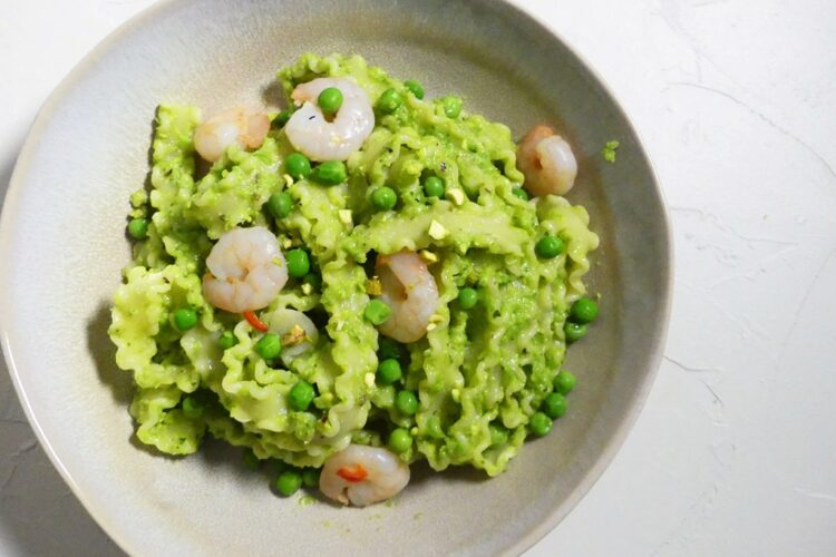 Ich hatte diesmal ein bisschen Entscheidungsschwierigkeiten, was das Rezept angeht, aber letzlich sind es diese Nudeln geworden – und es wird sie bestimmt mal wieder geben. Das Pesto ist recht schnell gemixt und hat nicht nur eine hübsche Farbe, Erbsen und Pistazien passen gut zusammen und die Minze sorgt für etwas Frische. Als kleines Extra gibt es noch gebratene Garnelen – wer vegetarisch essen möchte, kann sie auch gerne weglassen. Oder vielleicht ein wenig gewürfelten Halloumi braten.