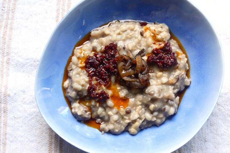Suppe ist im Grunde nicht richtig, Hareessa ist sehr dickflüssig, es ist eher Brei. Ich gestehe, ich habe mich nicht ganz ans Rezept gehalten. Da steht als Basis Perlgrütze, was immer das auch sein mag. Weizenschrot wäre wohl gut; ich habe statt dessen meinen Vorratsschrank geräumt und Gerstengraupen und einen Rest von einer Minestronemischung benutzt. Und: das hier ist ein Basisrezept, dass man beliebig mit Toppings aufmöbeln kann – frische Kräuter, übriges Röstgemüse, Nüsse … man ist da frei. Ich habe mich mit den dunkel gebratenen Zwiebeln aus dem Rezept zufrieden gegeben.
