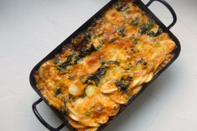 Die Sauce einmal durchrühren, Ricecakes und Mangold in die Pfanne geben und alles köcheln lassen, bis die Blätter zusammenfallen. Falls alles zu trocken erscheint, mehr Gemüsebrühe zugeben. Die Hälfte des Cheddars und des Mozzarellas in die Sauce rühren und alles in eine Auflaufform füllen.