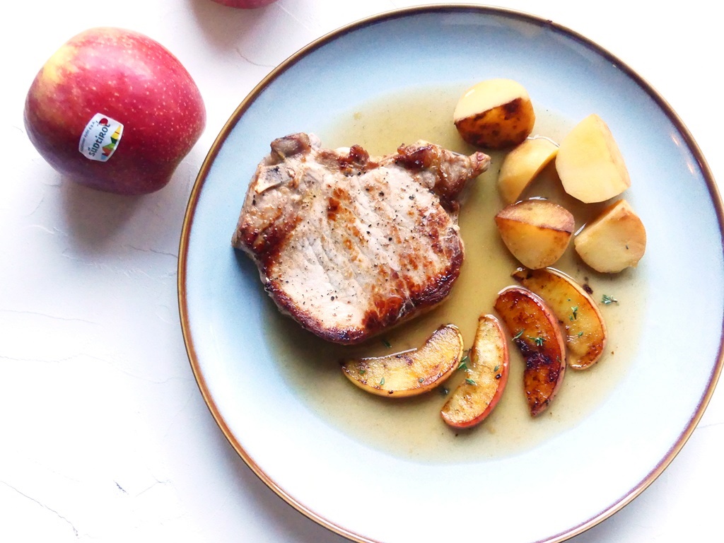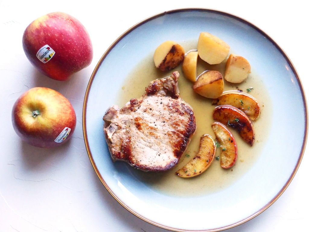 Zum Servieren jeweils etwas Sauce auf die Teller geben. Je ein Schweinekotelelett, Apfelspalten und Kartoffeln auf der Sauce anrichten und alles sofort servieren.