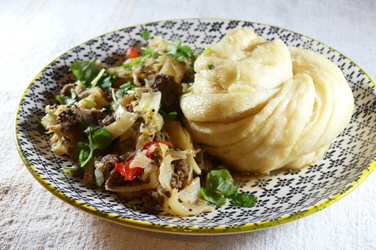 Tingmo mit dem Kohl servieren. Man isst das Ganze, indem man ein langes Stück von einem Tingmo abzieht und damit etwas vom Ragout aufnimmt.