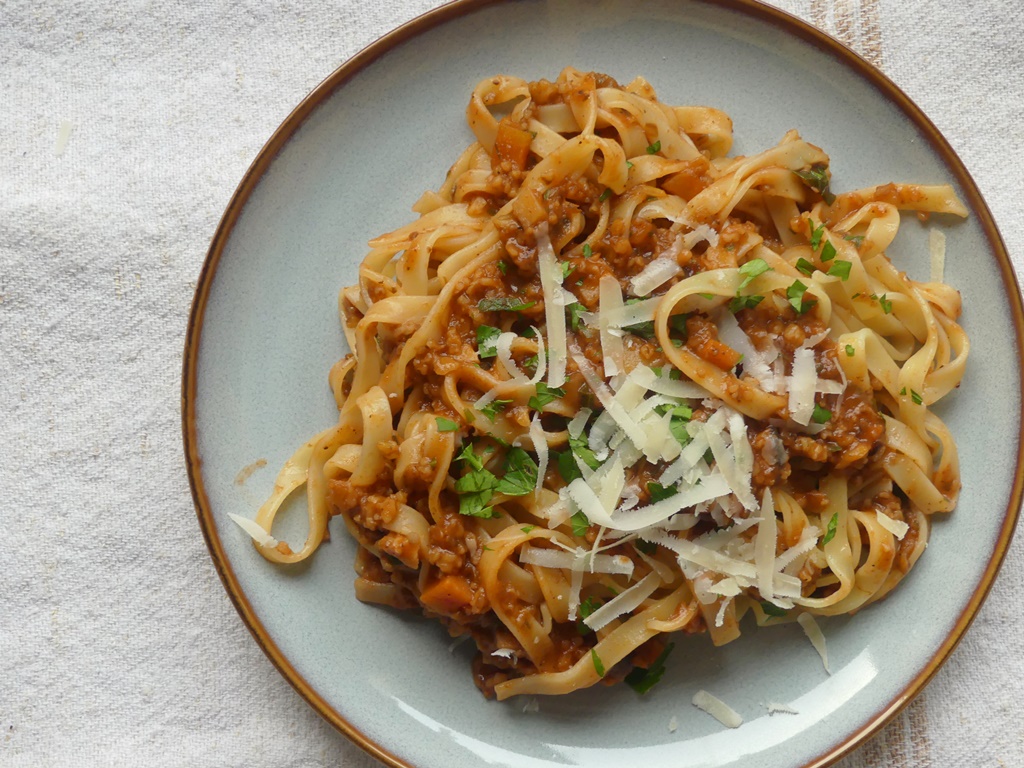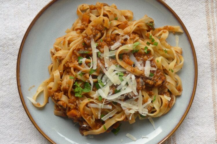 Ich habe die Bolognese zu Tagliatelle serviert – sie macht sich aber auch gut als Füllung in einer Lasagne. Die Sauce ist recht sättigend; Reste lassen sich aber gut einfrieren.