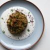 Anne-Katrin Weber* scherzt ein wenig, weil hier Kohlehydrate zu Kohlehydraten serviert werden – und es stimmt, wer Carbs mag, kommt hier auf seine Kosten. Für unsere Begeisterung waren trotzdem eher Geschmack und Konsistenz ausschlaggebend 😜. Grünkern ist ja unreif geernteter, gedarrter Dinkel und bringt einen leicht rauchigen, deftigen Geschmack mit – das macht sich sehr gut in der Sauce. Dabei hilft auch, dass das Getreide erst mal gut angeröstet wird. Und die Konsistenz des geschroteten Korns passt auch sehr gut. Und nebenbei – Kohlehydrate hin oder her, Grünkern ist schon recht gesund mit einem hohen Eiweißanteil und vielen Mineralstoffen.