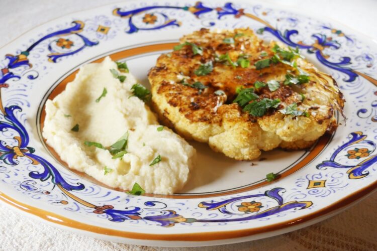 Blumenkohlsteaks auf Teller verteilen, mit dem Püree anrichten und servieren.