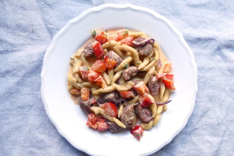 Serviert werden die Nudeln in einer Rahmsauce mit frischer roter Paprika, dazu gibt es etwas Salsiccia – das ist aromatisch alles schön ausgewogen.