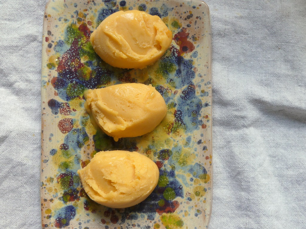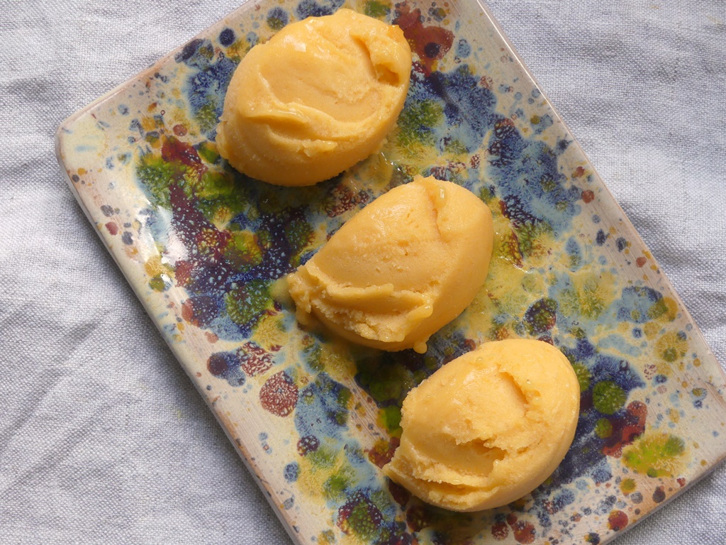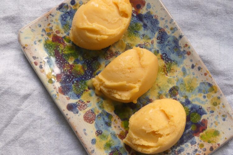 Der Grund für den gesteigerten Eiskonsum ist natürlich der Ninja Creami*, der wohnt hier schon seit letztem Jahr und verwandelt so ziemlich alles in cremiges Eis. Zur Not auch eine Dose Ananas. Wie Ulrike so schön sagt – es ist ein Pacojet für Arme, und wer einmal Eis aus dem Pacojet genossen hat möchte nicht mehr zurück. Ich werfe seither jedenfalls mögliche in die Creami-Behälter und wir sind meist glücklich damit. Womit ich nicht so glücklich bin, ist das Fotografieren von Speiseeis, aber für dieses Sorbet habe ich mich mal überwunden.