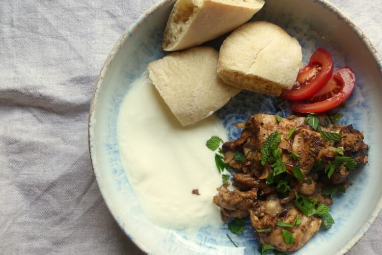 Ich habe mich natürlich ein wenig umgesehen; und besonders angetan hat es mir das Rezeptregister nach Ländern. Da bin ich auch rasch fündig geworden – seit einem Aufenthalt in Israel liebe ich Shawarma, habe es aber noch nie selbst gemacht. Höchste Zeit also, und Lauras Rezept ist wirklich easy und schmeckt super. Es wird Hühnchen verwendet; ich habe dafür Hühnerschenkel entbeint. Das Fleisch finde ich saftiger und geschmacklich intensiver als Hühnerbrust. Laura gibt mehrere Möglichkeiten an, das Fleisch zu garen. Ich habe die Grillpfanne benutzt, das würde ich nicht wieder tun – Streifen gab es keine, da waren wohl die Stücke zu klein. Dafür durfte ich dann aber die Marinade aus den Rillen schrubben, uff. Beim nächsten Mal nehme ich einfach eine Bratpfanne.