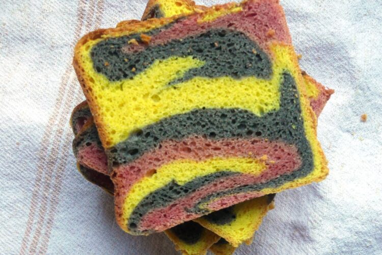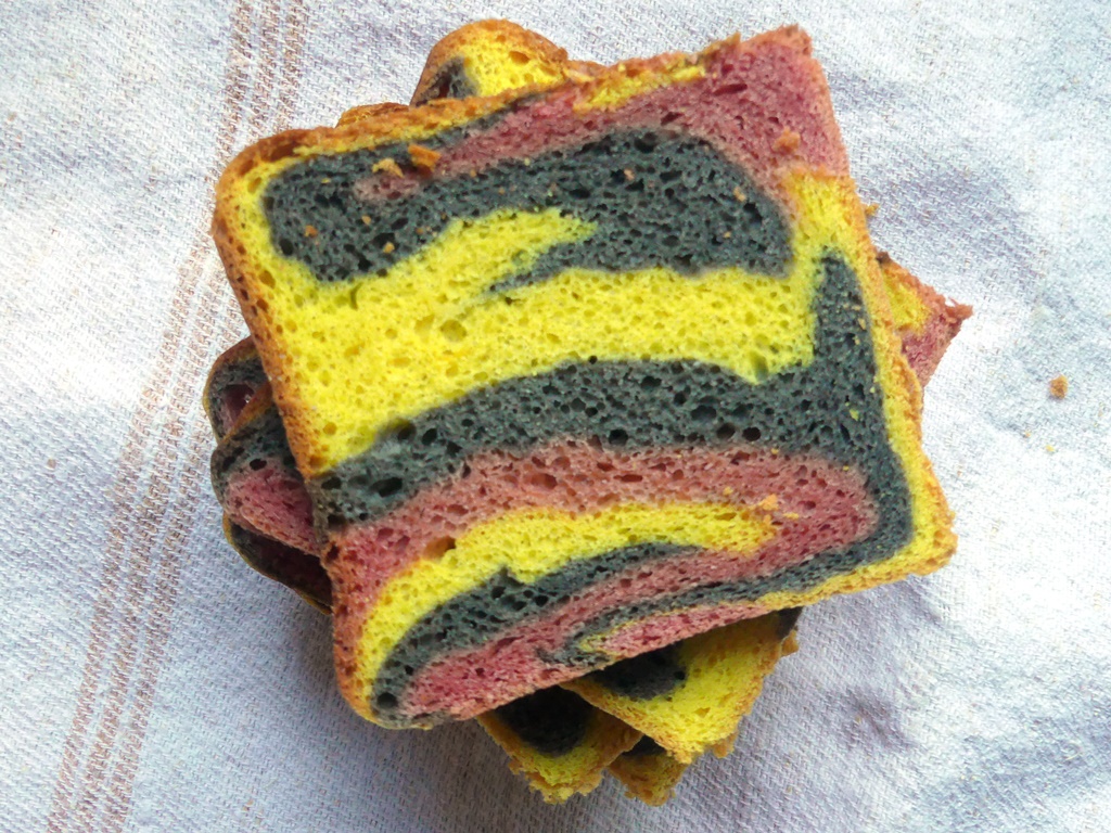 Jetzt zum Toastbrot: das sieht nicht nur lustig aus, sondern ist auch ein sehr gutes Toastbrot. Wer das Bunte nicht so mag, kann den Teig auch ohne Farbe backen, dann braucht man 450 g Mehl, 11 g Frischhefe, 45 g Zucker, 9 g Salz, 1 Ei, 45 g Butter und 300 g Milch. Original wird das Brot gegen Ende der Backzeit noch mit einem Zuckersirup bepinselt; das habe ich gelassen, ich fand es ohnehin schon relativ süß.