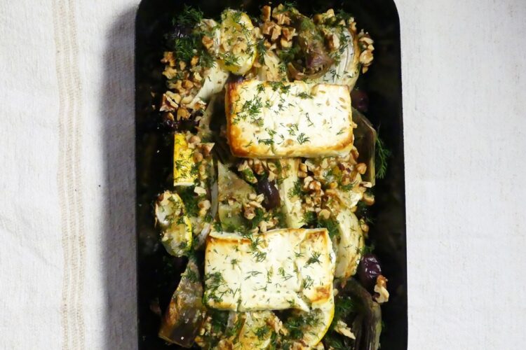 Den Feta auf das Gemüse legen. Die Form in den Ofen schieben, auf 180°C Ober- und Unterhitze stellen und alles ca. 50 min backen.