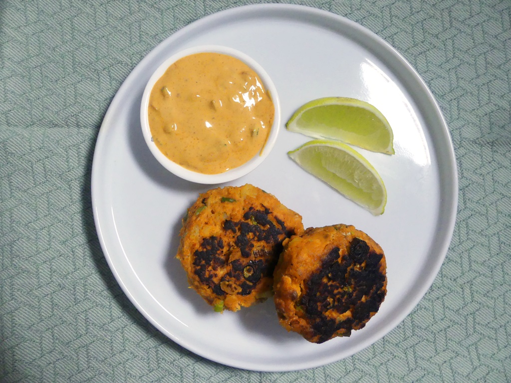 Ich liebe Fishcakes. Diese hier haben gegarte Kartoffeln und Süßkartoffeln als Basis, der Lachs wird dann roh eingearbeitet. Die Würze kommt von Chermoula und dazu gibt es eine Remoulade, die ebenfalls mit Chermoula gewürzt ist. Bei der Chermoula wird leider auf ein Fertigprodukt zuückgegriffen, das habe ich hier nicht gefunden und mir statt dessen ein Rezept gesucht. Meine Fishcakes sind in der Pfanne geradezu blitzartig viel zu dunkel geworden.