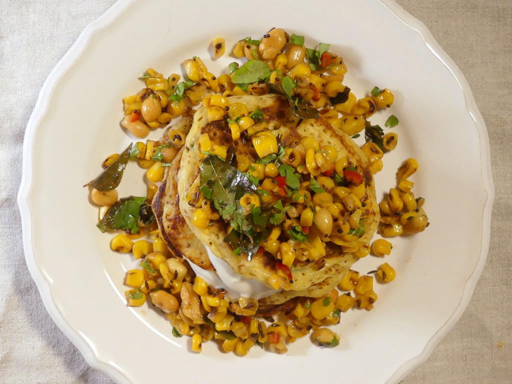 Offensichtlich hat es das Pfannkuchenkapitel für mich in sich – das sind Polentapfannkuchen, die mit Crème fraîche serviert werden und einem Maissalat, der es in sich hat.