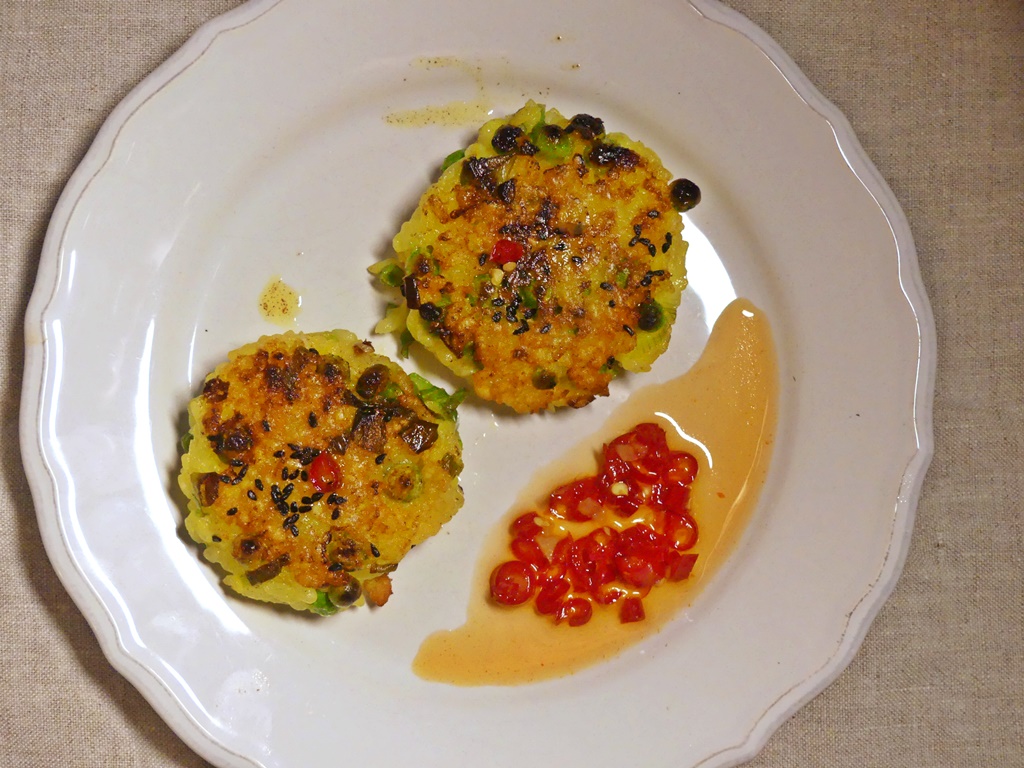 Diese Küchlein auf der Basis von Sushireis werden mit Kurkuma gewürzt und mit Erbsen und Käse angereichert; dazu gibt es eine schnelle, selbstgemachte süß-scharfe Sauce.